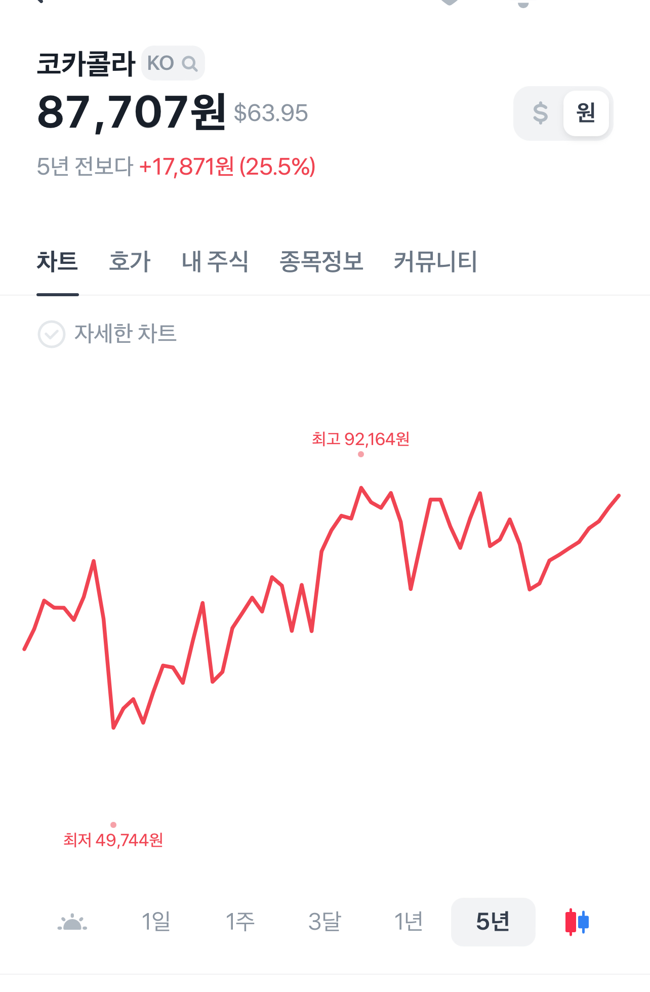 최근 코카콜라의 주가는 2023년 9월까지 하락하다가 반등하여 현재 우상향 추세를 보이고 있습니다. 전 고점보다 약간 더 오른 주가를 확인할 수 있습니다. 5년 차트에서는 2020년 코로나 이후로 주가가 횡보하는 흐름을 보여주고 있습니다.